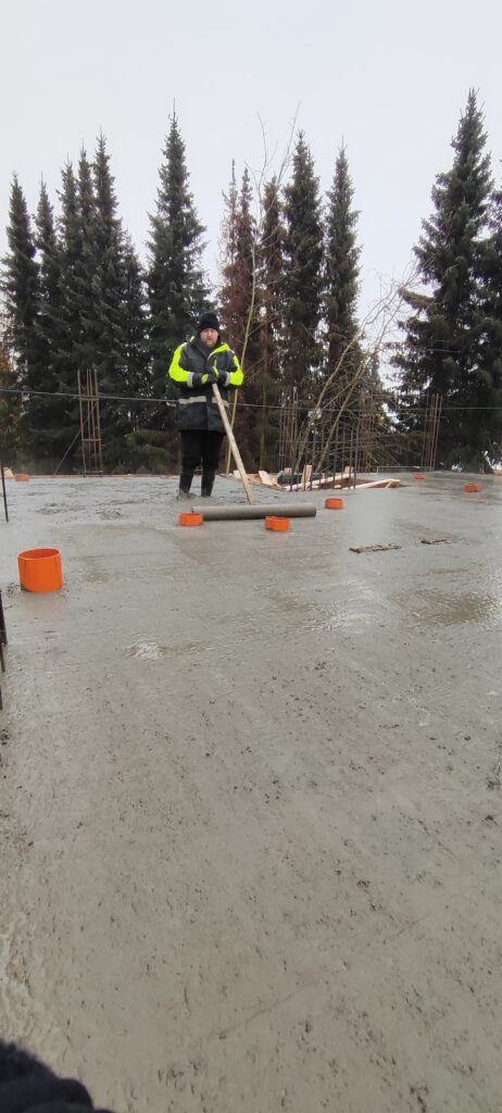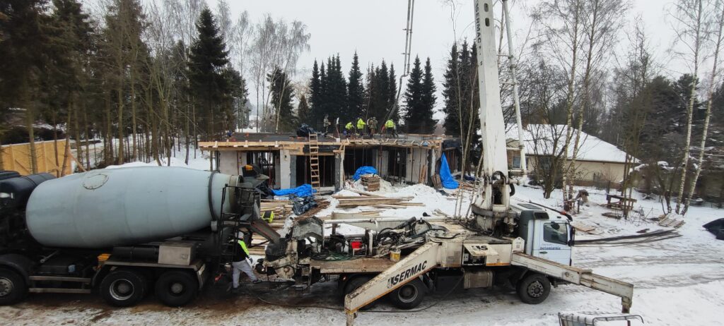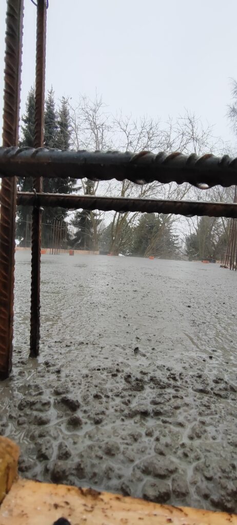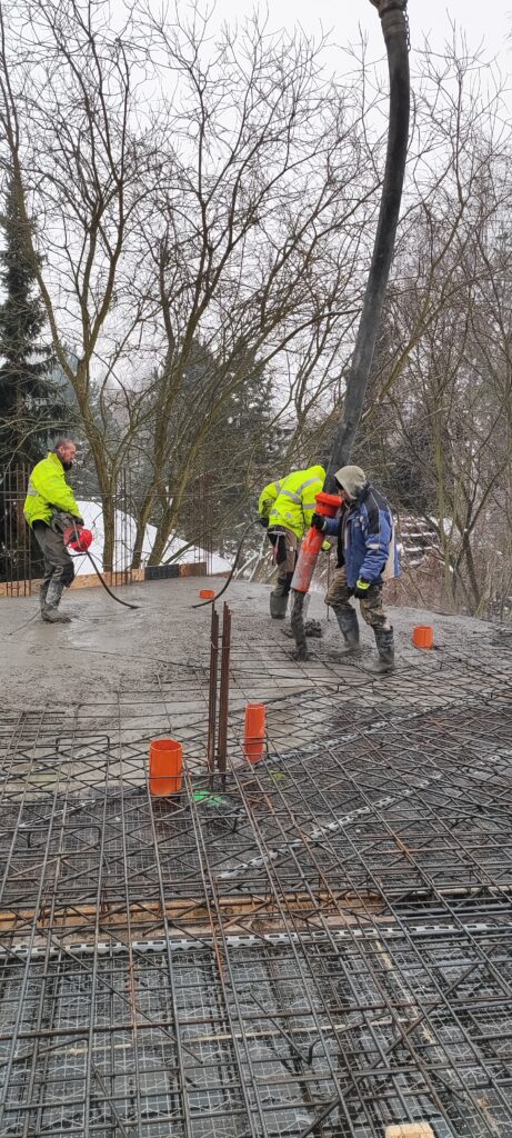 6 lutego 2026 roku zakończyliśmy betonowanie ostatniego stropu – w budynku A, domykając tym samym cały etap prac stropowych w inwestycji. Pomimo trwającej od początku stycznia mroźnej i śnieżnej zimy, prace na budowie są prowadzone nieprzerwanie z wyczuciem pogody, dużą dyscypliną i zaangażowaniem zespołu. Na ten dzień mamy już wymurowane ściany nośne piętra w budynkach B i C, a także rozpoczęte murowanie ścianek działowych parteru w budynku B. To bardzo satysfakcjonujący moment, który pokazuje, że nawet trudne warunki nie zatrzymują realizacji projektu. Przed nami kolejne etapy, o których będziemy informować na bieżąco.